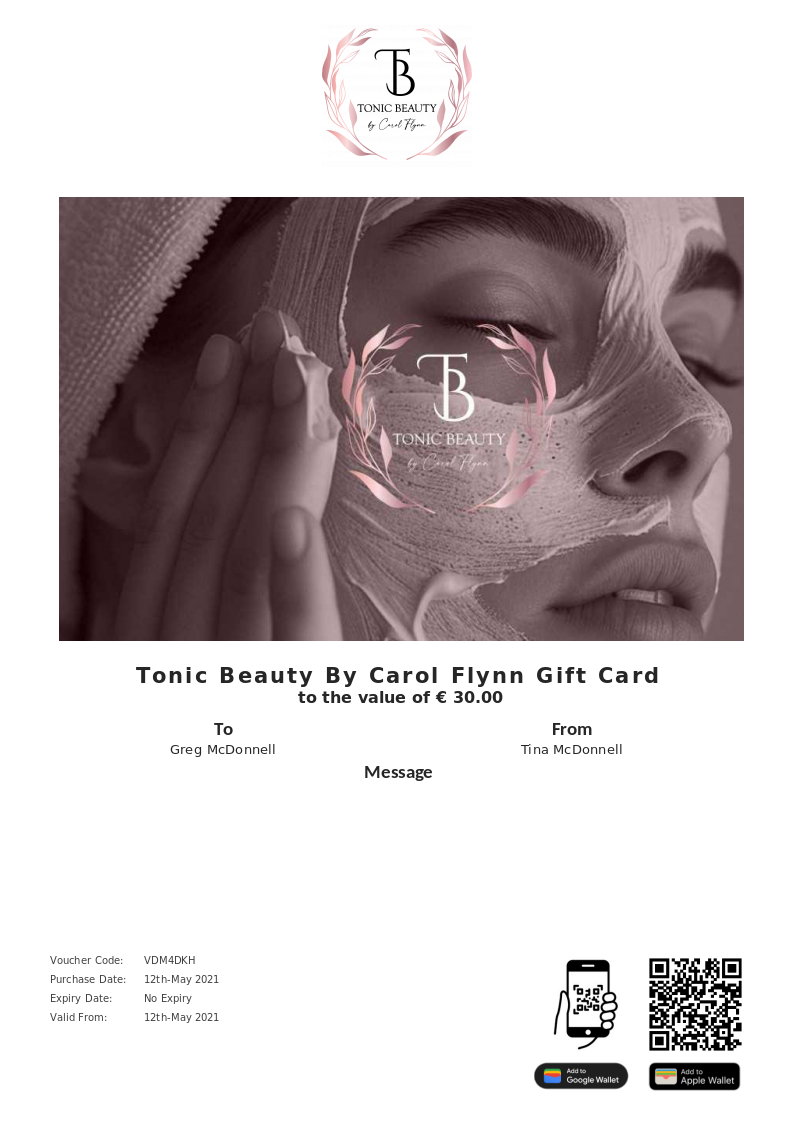 Tonic Beauty By Carol Flynn allows you to purchase instantly printable gift vouchers, special offers and tickets using the Voucher Connect platform.